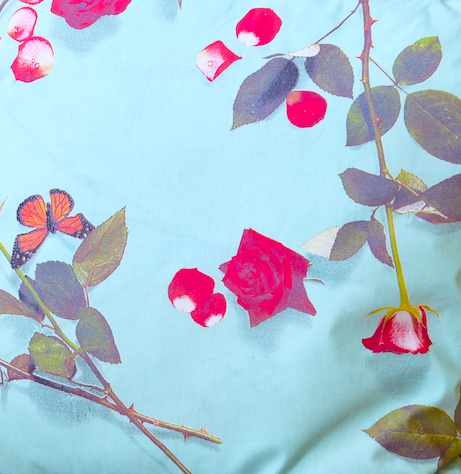 This breathtakingly beautiful ‘Bed of Roses’ print features freshly cut roses still glistening with morning dew and resting butterflies, strewn across the finest 100% Egyptian cotton. The print is photo realistic and the flowers and butterflies are actual size, creating a fresh and modern take on traditional floral print fabrics.