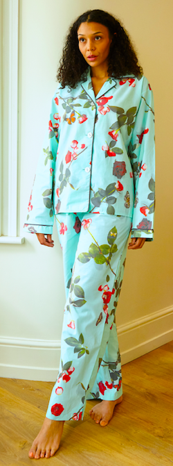 These pretty floral print pyjamas are a classic shape and come in a choice of two sizes: small (8-10) and large (16-18). The pyjama top has a classic rever collar and turned back cuff detail, accentuated with a charcoal grey bias binding trim and also features lovely mother of pearl buttons. The pyjama trousers have a drawstring waist and pockets in the side seams.