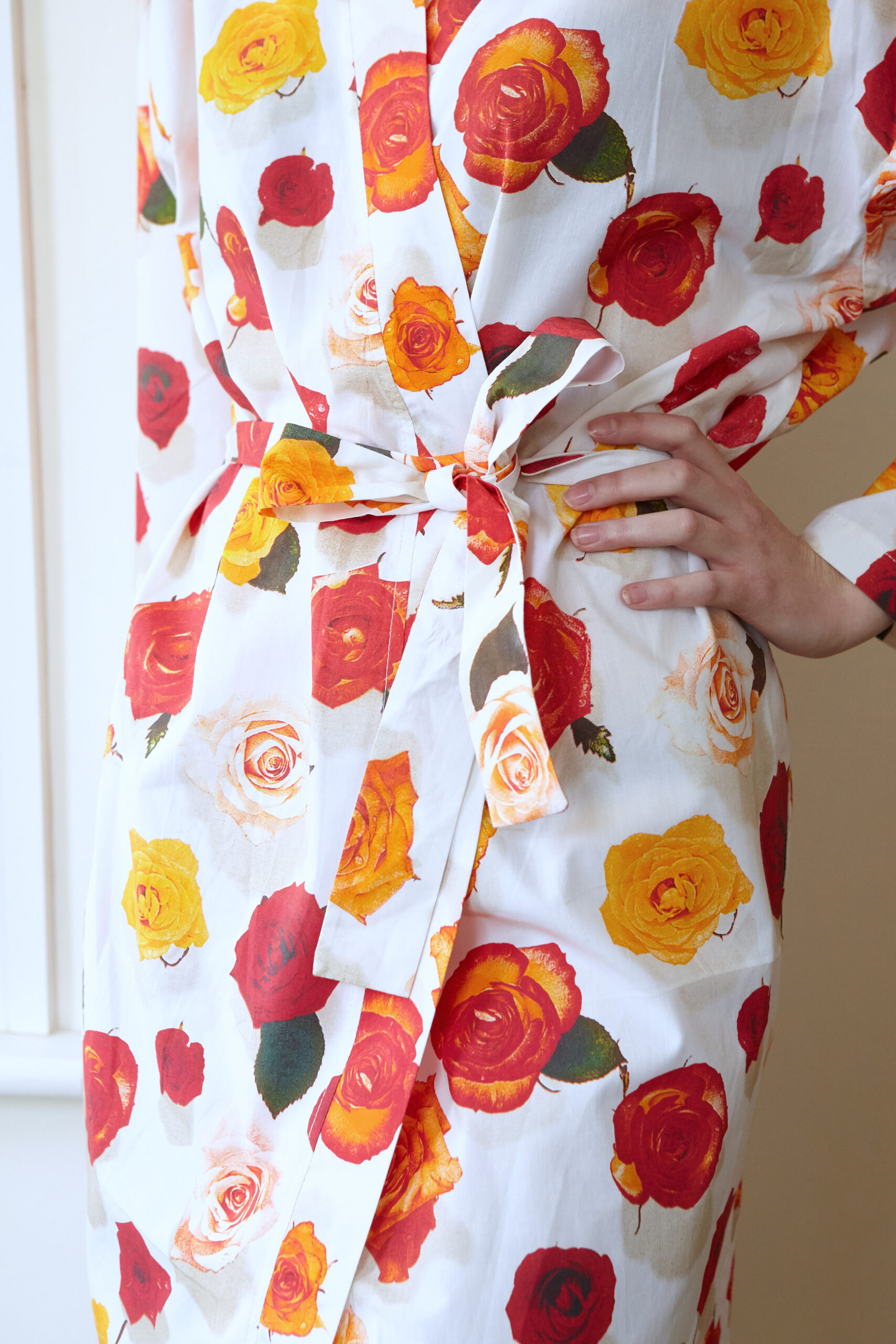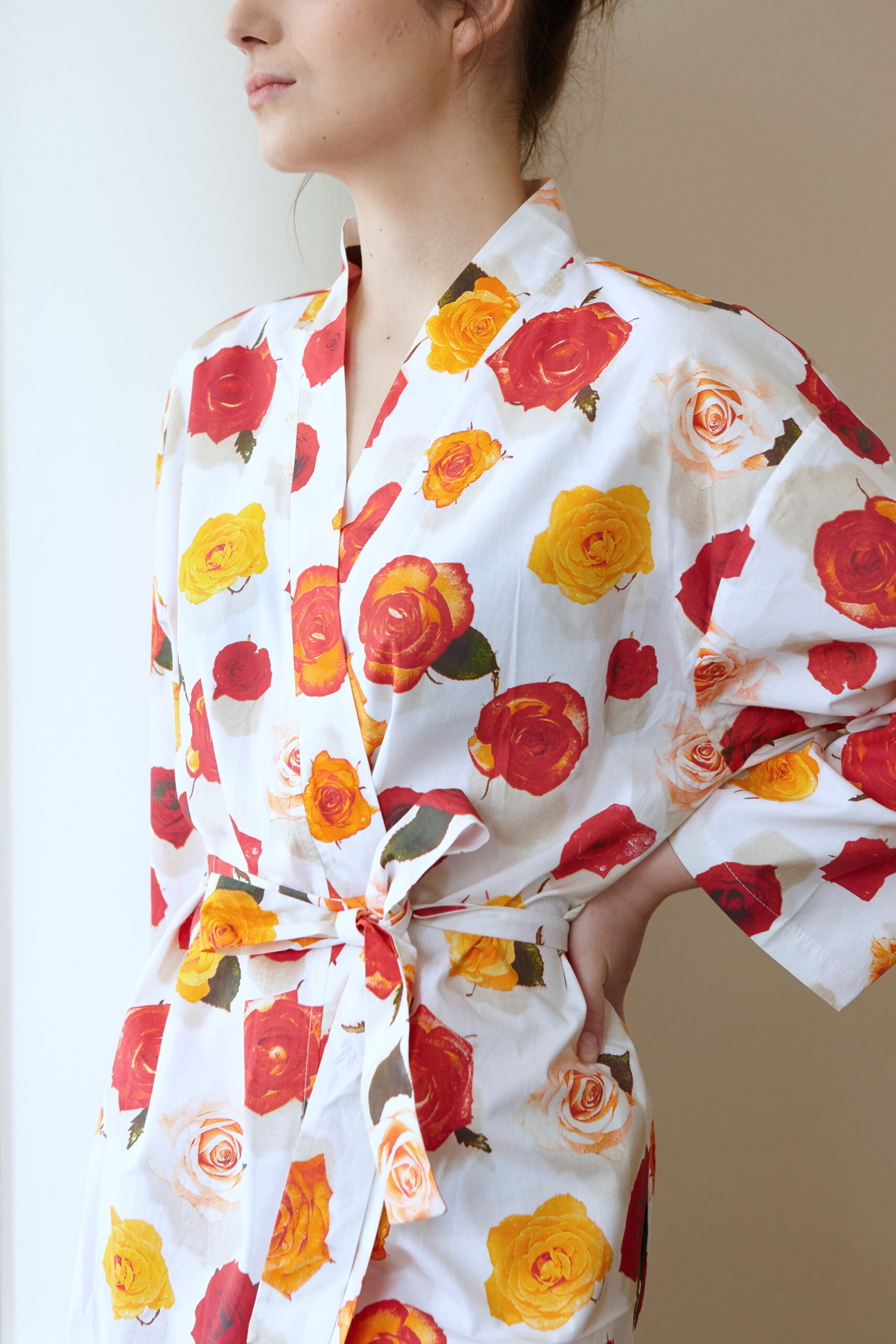 This elegant kimono style bath robe is made from 100% Egyptian cotton (200 thread count). It is unlined and a perfect light weight, summer dressing gown. The robe has a tie belt and pockets hidden in the side seams.